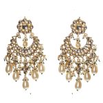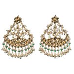 Gold plated chandelier earrings with mint green and small cluster pearl drops.