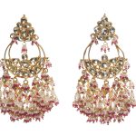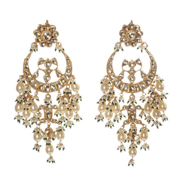 Long gold plated statement earrings with pearl drops.