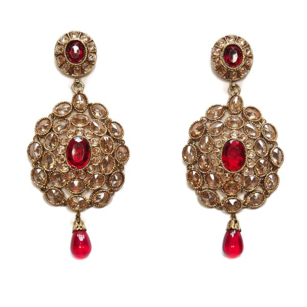 Very pretty champagne crystal earrings with ruby red stones. The single red tear drop with a gold top adds a lovely detail.
